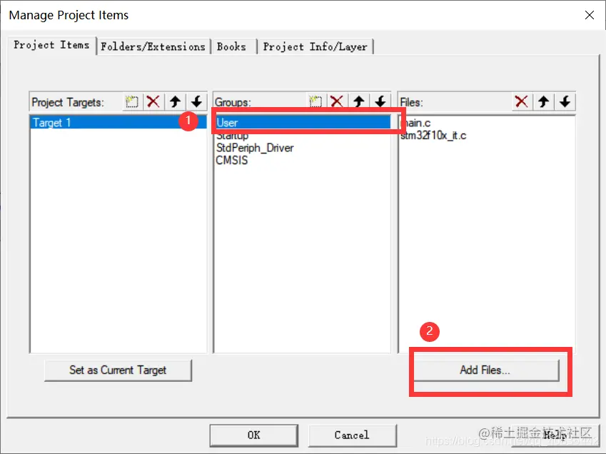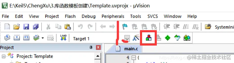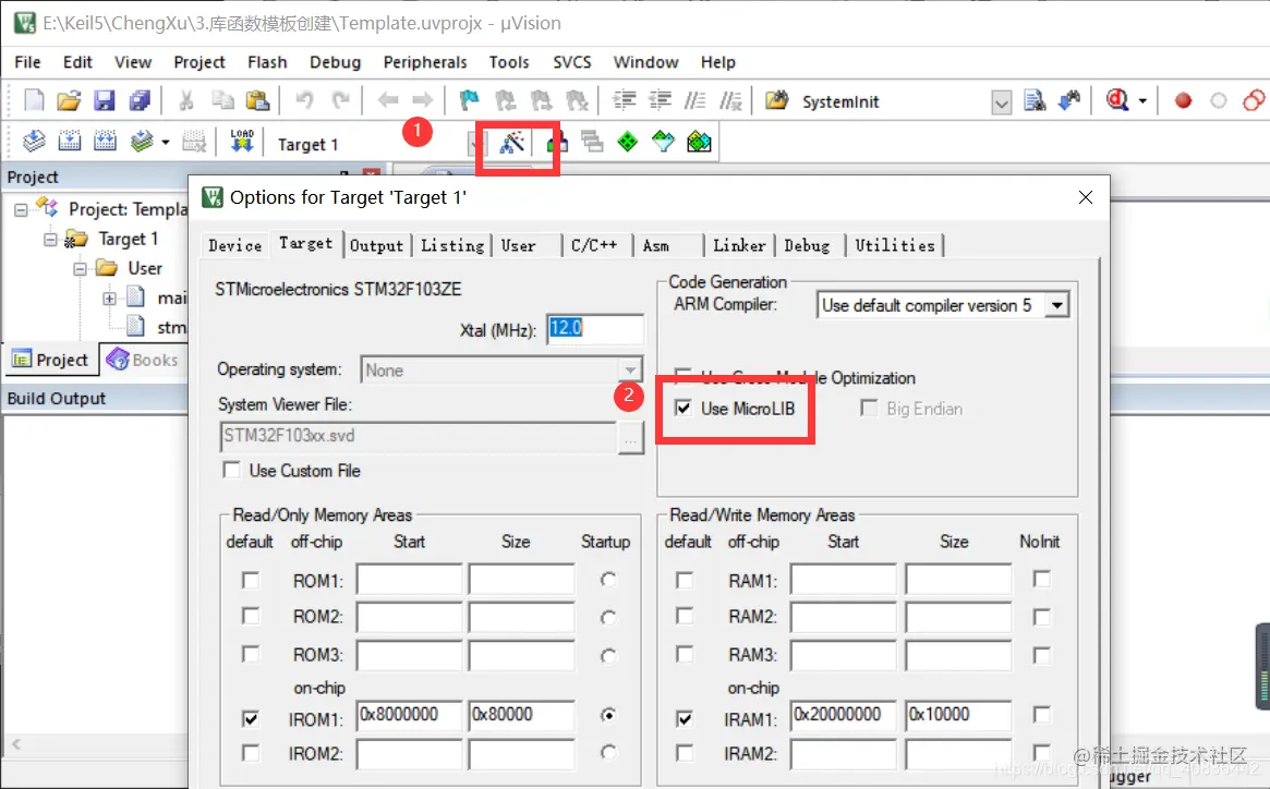 点击魔术棒图标,使用微库Use MicroLIB,便于用printf输出