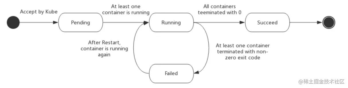 - 失败(Failed):Pod 中的所有容器都已终止了,并且至少有一个容器是因为失败终止。也就是说,容器以非0状态退出或者被系统终止。