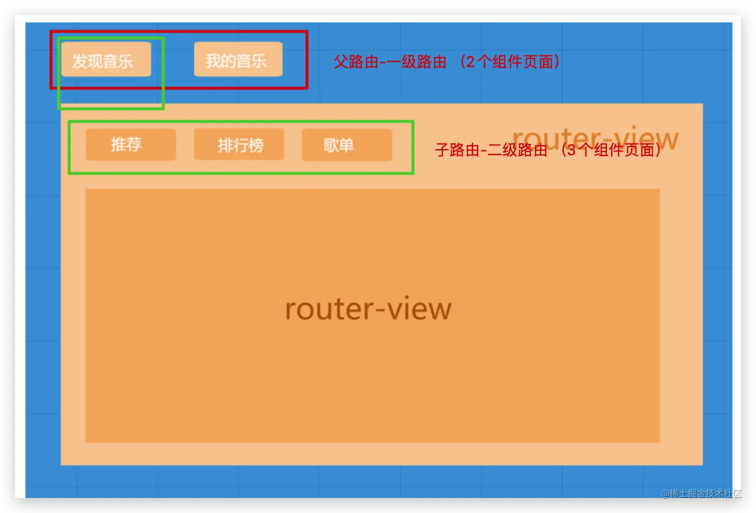 - FindMusic.vue 内层的router-view负责发现音乐下的子路由页面切换