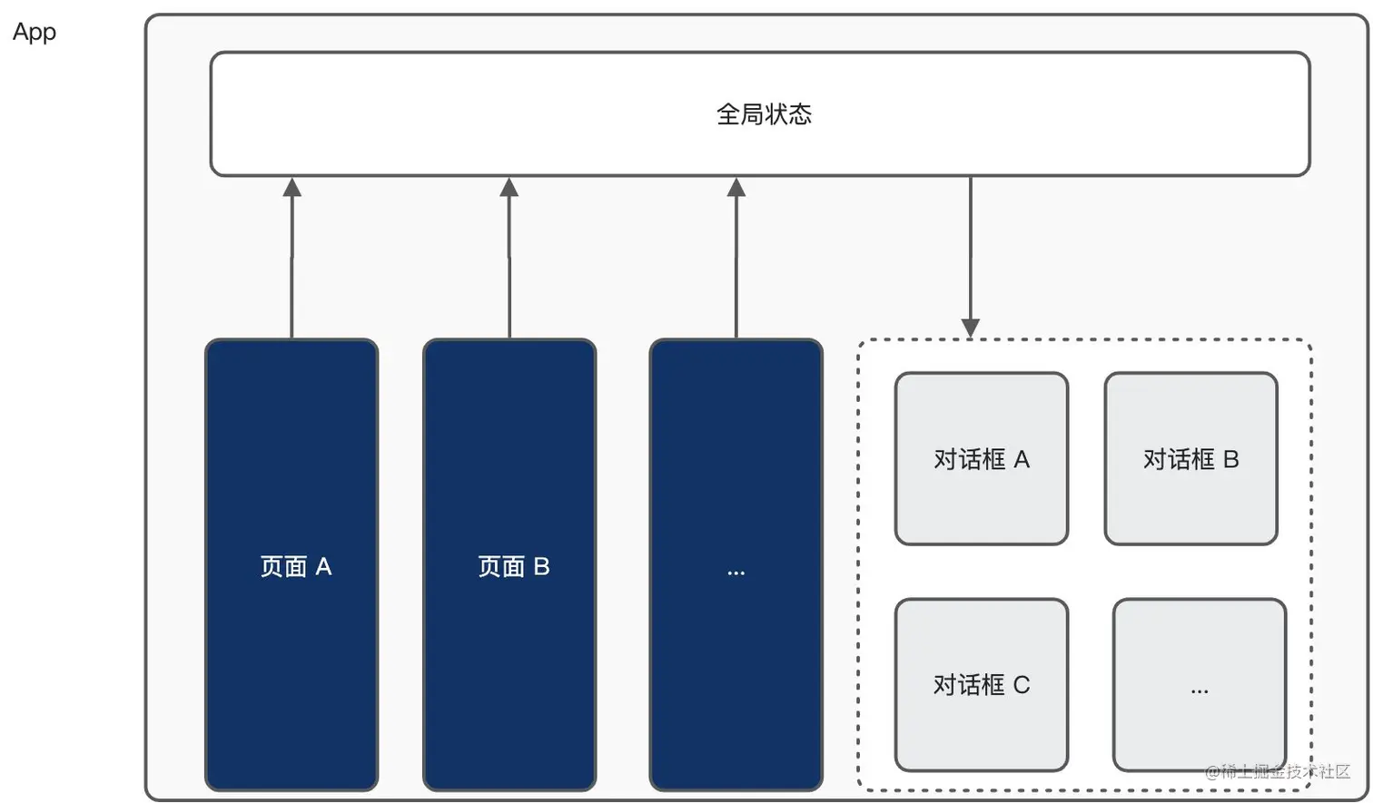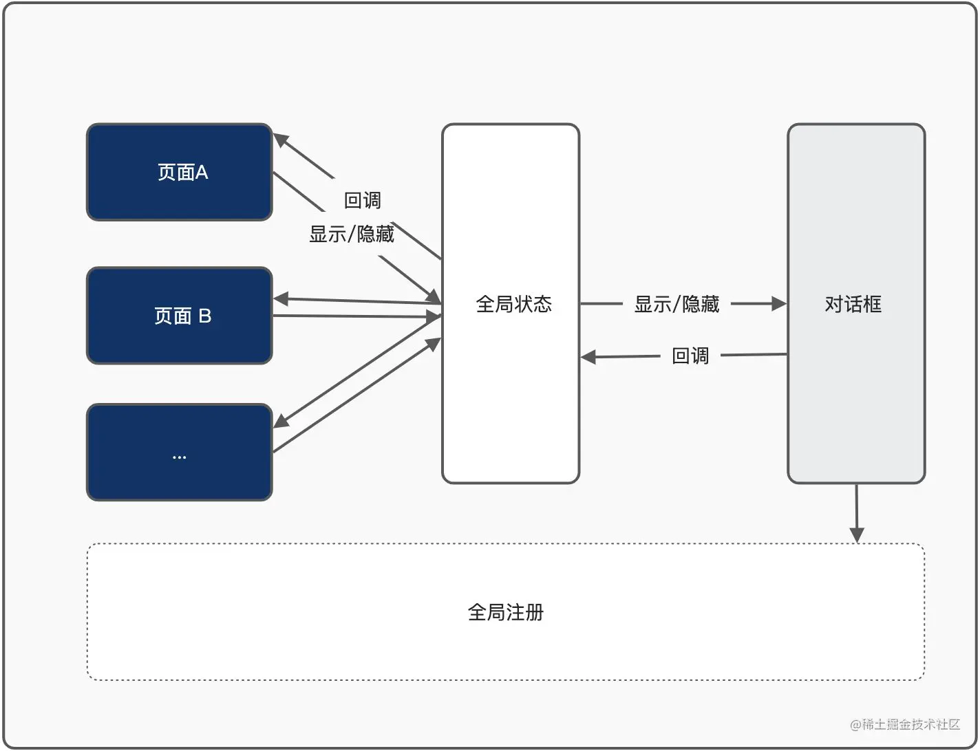 分享了一种使用对话框的实践方式:利用全局状态来管理对话框。解决上文提到的在使用对话框遇到的问题。其核心思路在于从 UI 模式的角度出发,把对话框也可当做一个单独的页面,对话框的展示可用全局状态来管理,因此,用全局的方式去管理对话框就是一种非常合理的方式。从而让组件的语义更加清楚,代码更容易理解和维护。