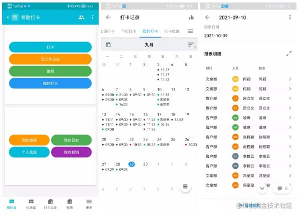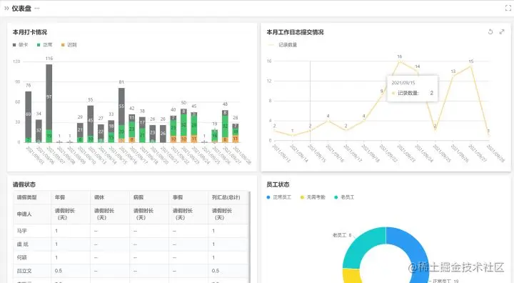 将打卡、工作日报、请假三个维度的数据配置成仪表盘,供管理人员统筹数据。