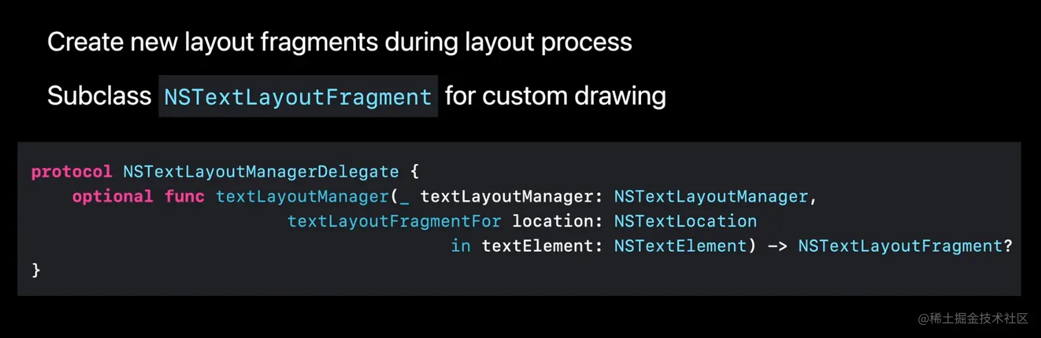 那么我们可以从哪个时机给系统我们自定义的 NSTextLayoutFragment 呢?答案是在 NSTextLayoutManagerDelegate 协议中。