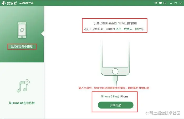 第二步: 安装成功后,将电脑上的杀毒软件都关闭,打开软件并将手机连接到电脑中,尽量使电脑跟手机的网络为同一网络,当设备出现【设备已连接】的提示后,默认【从iOS设备中恢复】的模式,点击【开始扫描】。