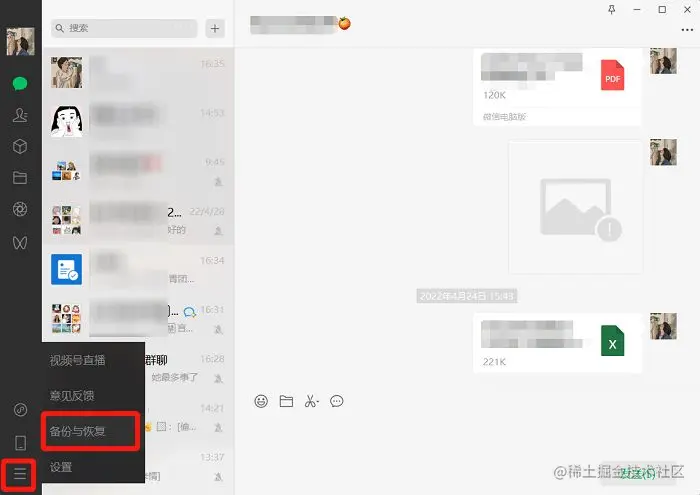 第一步: 打开电脑中的微信并登录,点击进入微信主页面左下角的三条横线的图标,即可跳出一个小对话框,在这个对话框中点击【备份与恢复】。