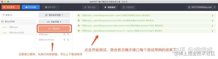 1、流程测试时,请注意每个流程里面的接口顺序,先执行的需要放在前面。例如:把登陆接口放前面,以便于后续的接口直接使用登陆接口返回的token参数。
