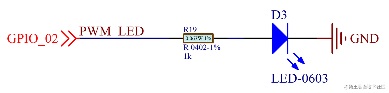 使用板载的LED来验证GPIO的输出功能,在BearPi-HM_Nano开发板上LED的连接电路图如下图所示,LED的控制引脚与主控芯片的GPIO_2连接,所以需要编写软件去控制GPIO_2输出高低电平实现LED灯的亮灭。
