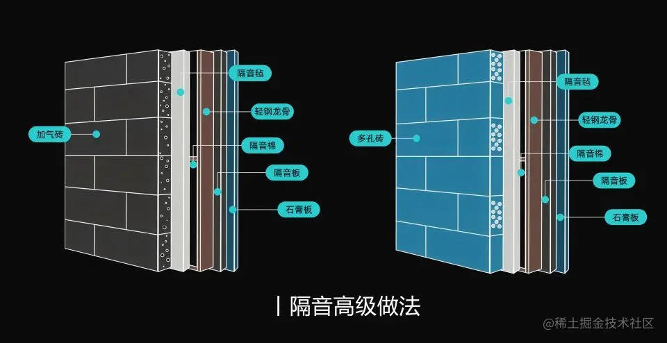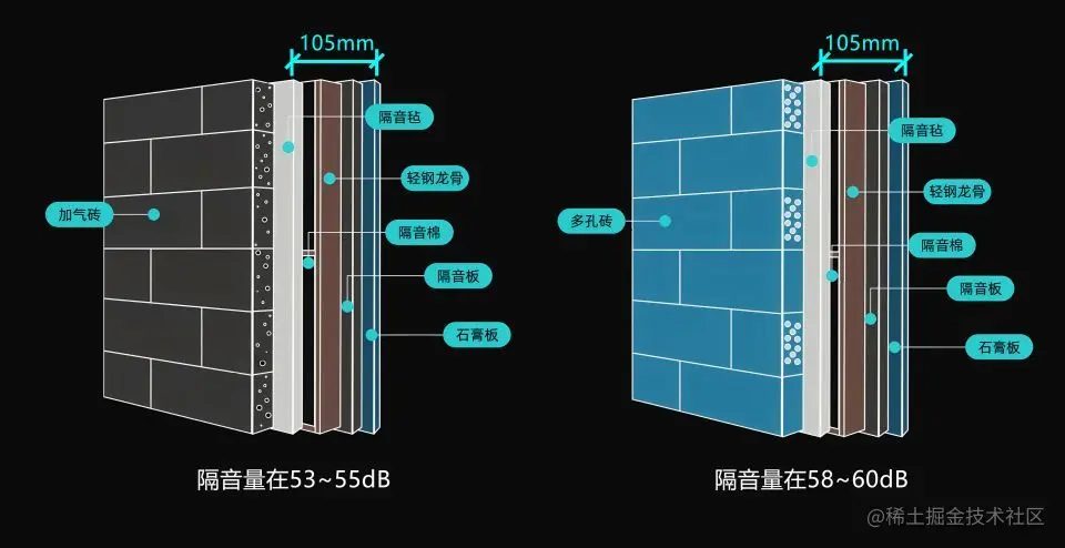 这四层基础结构所占的总厚度大致在105mm左右,加气块墙面在处理后隔音量可以达到5355dB,多孔砖墙面处理后隔音量可以达到5860dB。