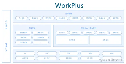 WorkPlus统一集成OA、BPM、ERP等各类业务系统,将各业务系统应用在同一页面进行展示;一站式登录融合打通用户数据、账号数据,快速将企业的独立系统整合为统一门户,汇聚业务系统的消息、待办到统一门户中,大幅提升企业的工作效率。按照组织架构、层级权限、角色等进行多架构层次,形成千人千面工作台,覆盖企业的各个业务场景,为企业提供优质的生态门户。
