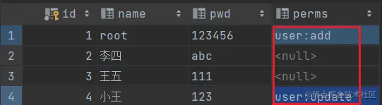 正常的情况下,数据库中有一个权限表,需要联表查询;这里直接在数据库表中,增加一个字段来进行操作: