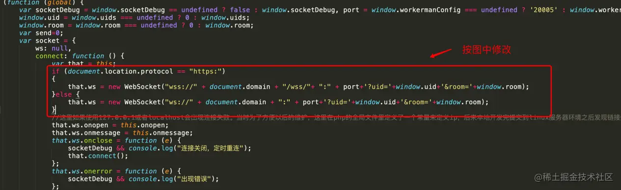 配置完成后需要修改知识付费中根目录 public/wap/first/zsff/js/WebSocket.js 文件,用来区别 https 和 http 访问