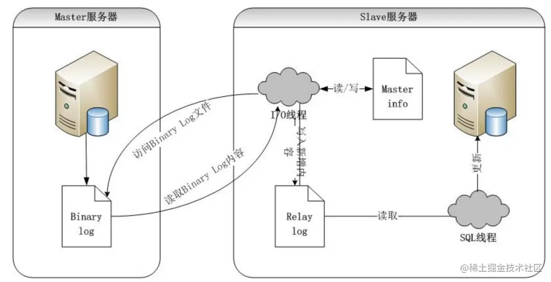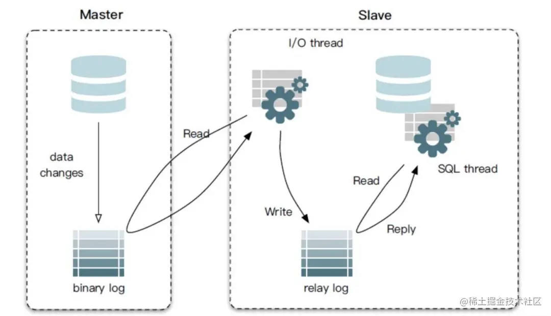 master 主节点的 binlog 传到 slave 从节点后,被写入 relay log 里,从节点的 slave sql 线程从 relaylog 里读取日志然后应用到 slave 从节点本地。从服务器 I/O 线程将主服务器的二进制日志读取过来记录到从服务器本地文件,然后 SQL 线程会读取 relay-log 日志的内容并应用到从服务器,从而**「使从服务器和主服务器的数据保持一致」**。