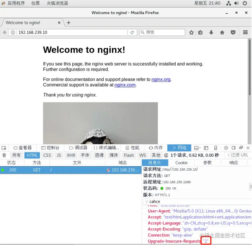 访问 http://192.168.239.10 ,双击200响应消息查看响应头中包含 Content-Encoding: gzip