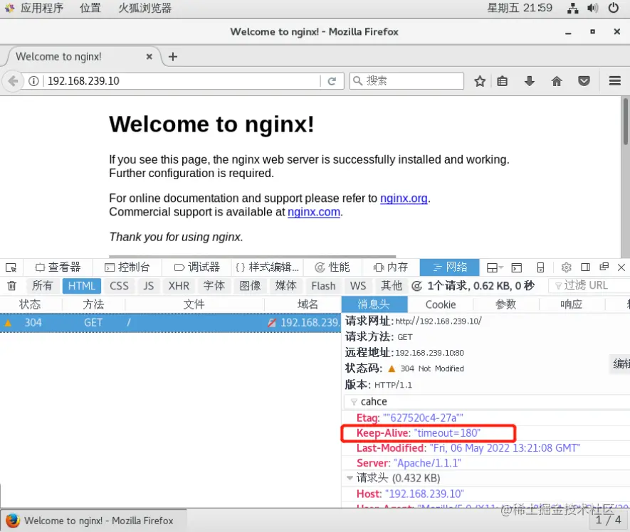 可以使用 Fiddler 工具抓取数据包,查看 Nginx版本,也可以在 CentOS 中使用命令 curl -I http://192.168.239.10显示响应报文首部信息。