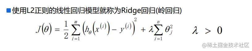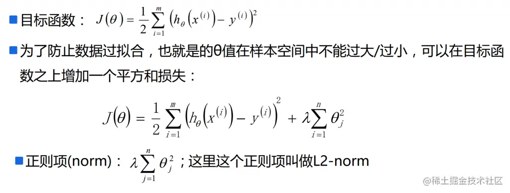 - 最小二乘法的使用要矩阵XT是可逆的;为了防止不可逆或者过拟合的问题存在,可以增加额外数据影响,导致最终的矩阵是可逆的: θ = (XTX + λI)-1XTY