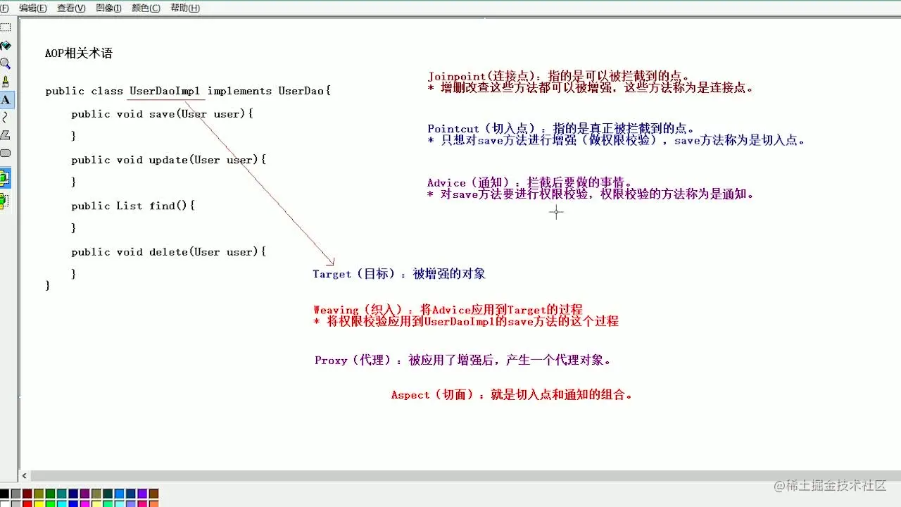 - **Weaving(织入):是指把增强应用到目标对象来创建新的代理对象的过程。**spring采用动态代理织入,而AspectJ采用编译期织入和类装载期织入