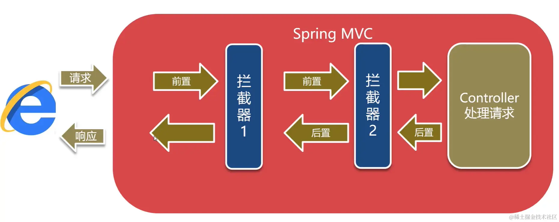 当一个URI被多个拦截器同时拦截时,前置处理执行先后顺序将以配置顺序为准,后置处理为反方向