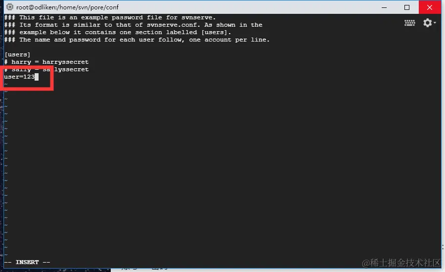 命令:vi authz进入文件内 使用键盘上的insert进入修改模式