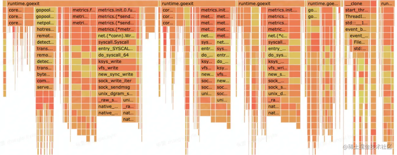 另外常见的性能问题就是高并发场景的优化不足,左边是服务高峰期的火焰图,右边是低峰期的火焰图,可以发现metrics, 即监控组件的CPU资源占用变化较大,主要原因是监控数据上报是同步请求,在请求量上涨,监控打点数据量增加时,达到性能瓶颈,造成阻塞,影响业务逻辑的处理,后续是改成异步上报的机制提升了性能