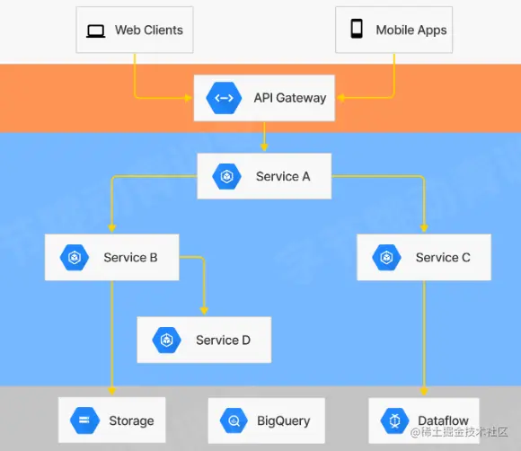 右边是系统部署的简单示意图,客户端请求经过网关转发,由不同的业务服务处理,业务服务可能依赖其他的服务,也可能会依赖存储、消息队列等组件。接下来我们以业务服务优化为例,说明性能调优的流程,图中的Service B被Service A依赖,同时也依赖了存储和Service D