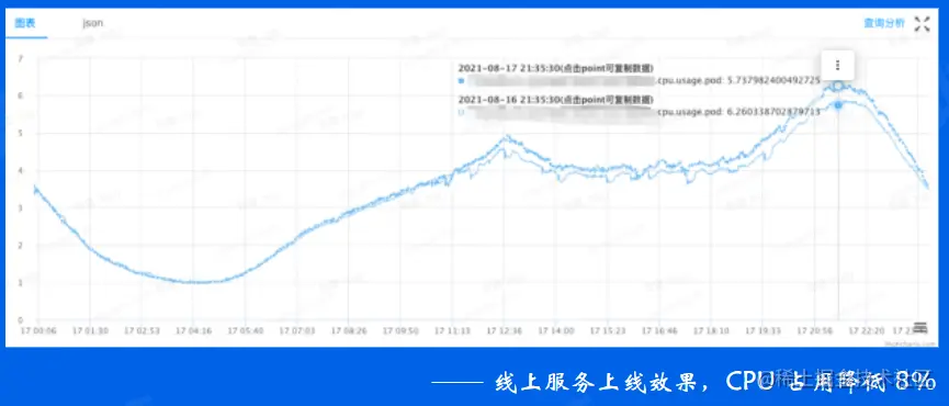 这样的优化业务服务接入非常简单,只要调整编译配置即可,通用性很强,几乎对所有go的程序都会生效, 比如右图中服务只是换用新的发行版本进行编译,CPU占用降低8%