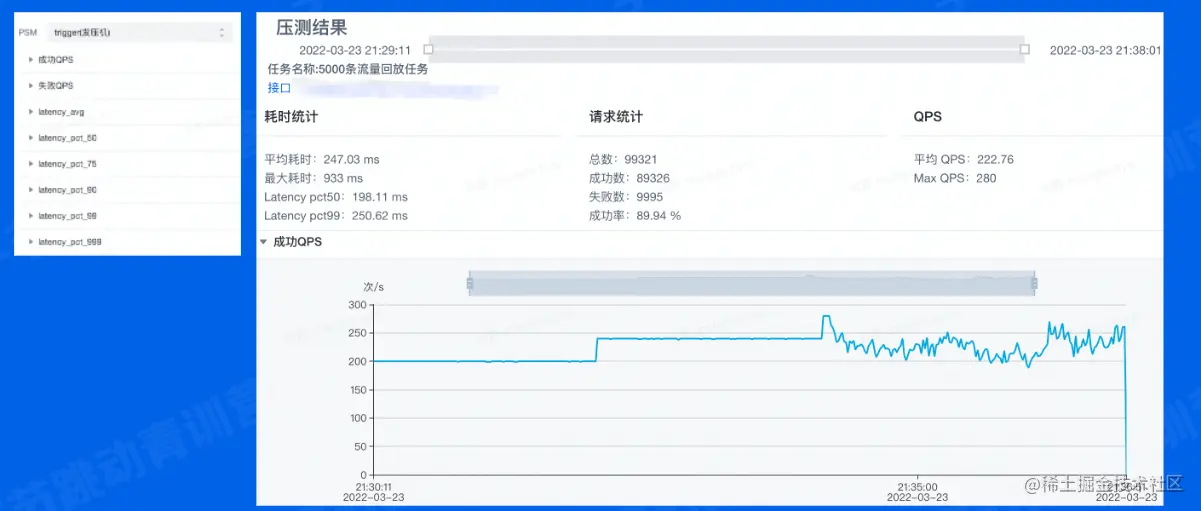 实际的压测报告截图,会统计压测期间服务的各项监控指标,包括qps,延迟等内容,同时在压测过程中,也可以采集服务的ppro数据,使用之前的方式分析性能问题