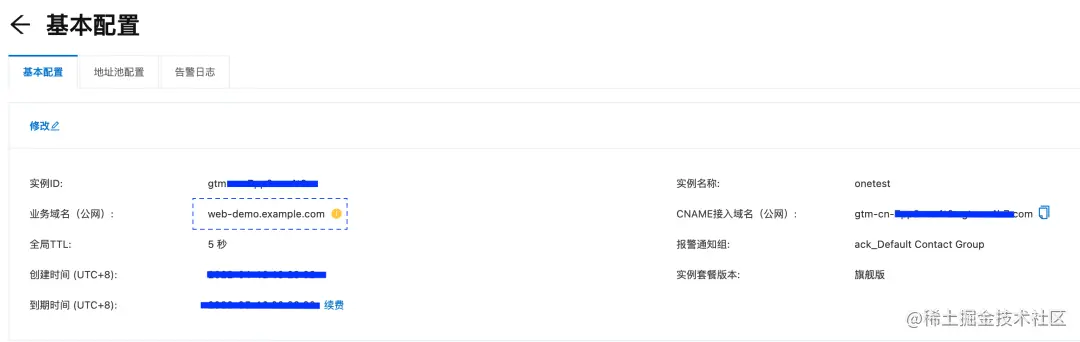 1. 配置全局流量管理实例,web-demo.example.com 为示例应用的域名,请替换为实际应用的域名,并设置 DNS 解析到全局流量管理的 CNAME 接入域名。