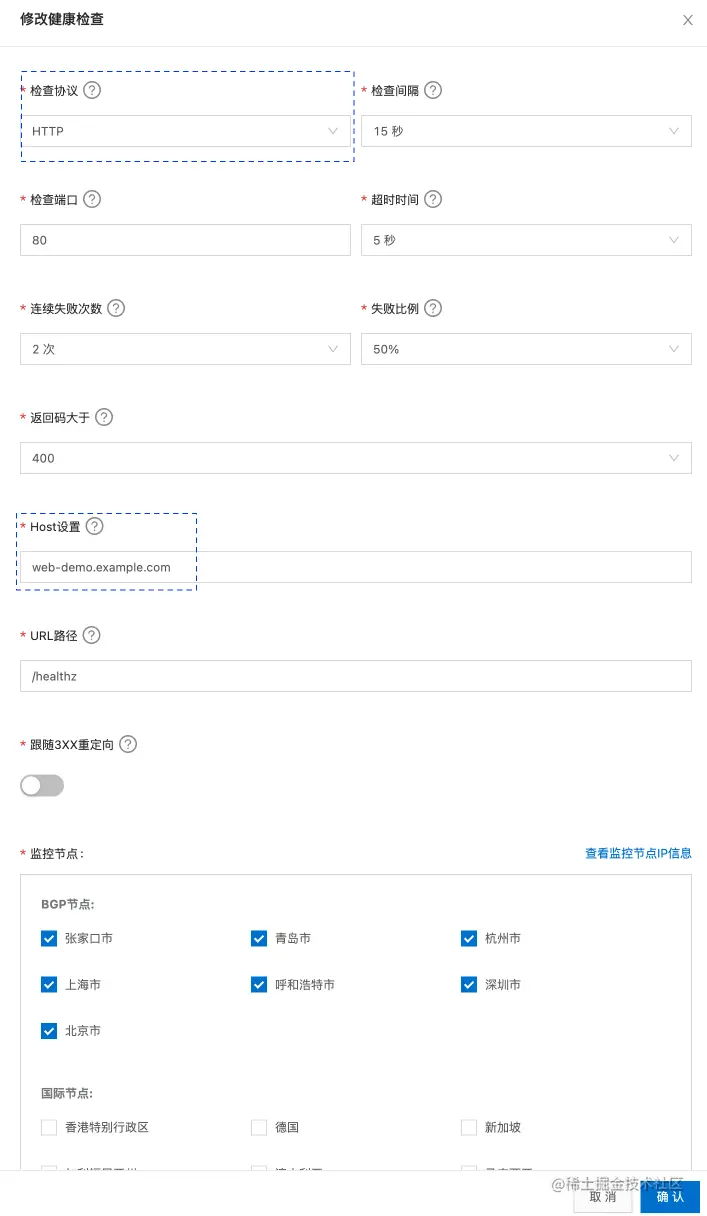 3. 在地址池中开启健康检查,检查失败的地址将从地址池中移除,不再接收流量。