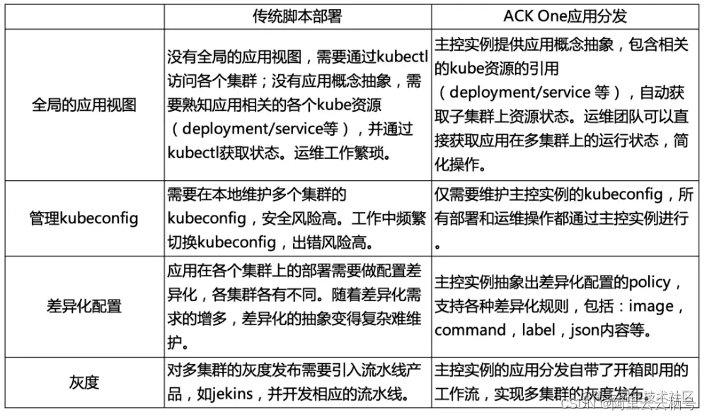 通过 ACK One 主控实例的应用分发功能**[4]**,在 3 个 K8s 集群中分发应用。对比传统的脚本部署,使用 ACK One 的应用分发可获得如下收益。