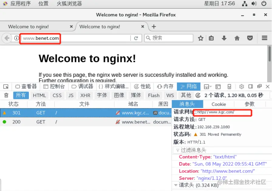 此时重启服务网页输入www.kgc.com会跳转到http://www.benet.…