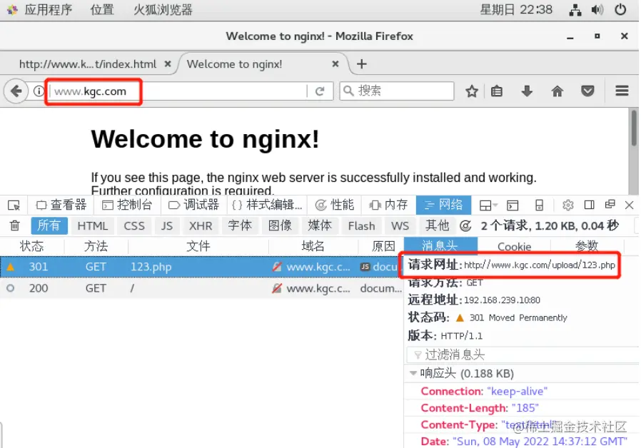 重启服务浏览器访问 www.kgc.com/upload/123.… 跳转到www.kgc.com页面。
