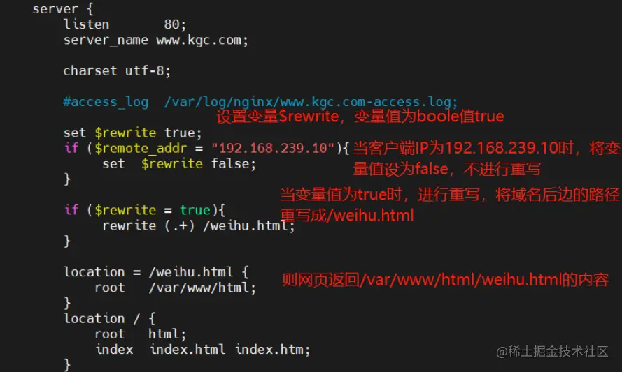 注: 如果rewrite (.+) /weihu.html; 改成rewrite (.+) /weihu.html permanent; 的话,如果是非 192.168.80.10 的主机访问会使浏览器修改请求访问的URL成 www.kgc.com/weihu.html 再请求访问,这样就会进入一直在 rewrite 的死循环,访问请求会一直被重写成 www.kgc.com/weihu.html 再请求访问