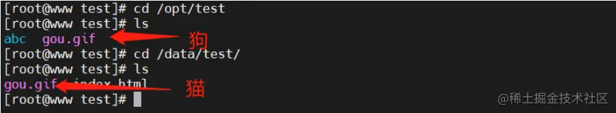 分别把狗和猫的图片放入/opt/test/gou.gif、/data/test/gou.gif取名为一样的,狗在opt猫在data。