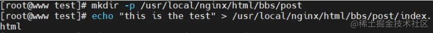 echo "this is test" >> /usr/local/nginx/html/bbs/post/index.html