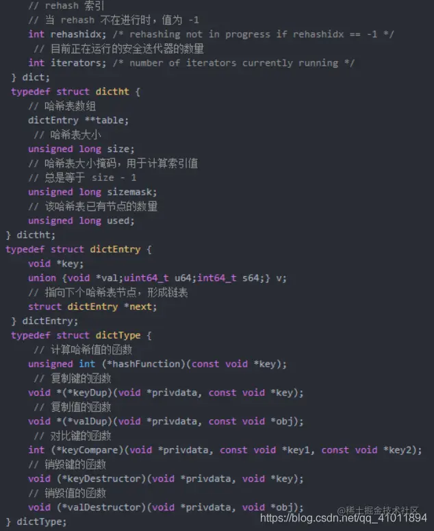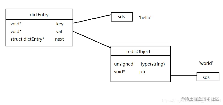 dictEntry: redis 给每个键值对都会分配一个 dictEntry, 里面有 key 和 val 指针, 还有指向下一个 dictEntry 的