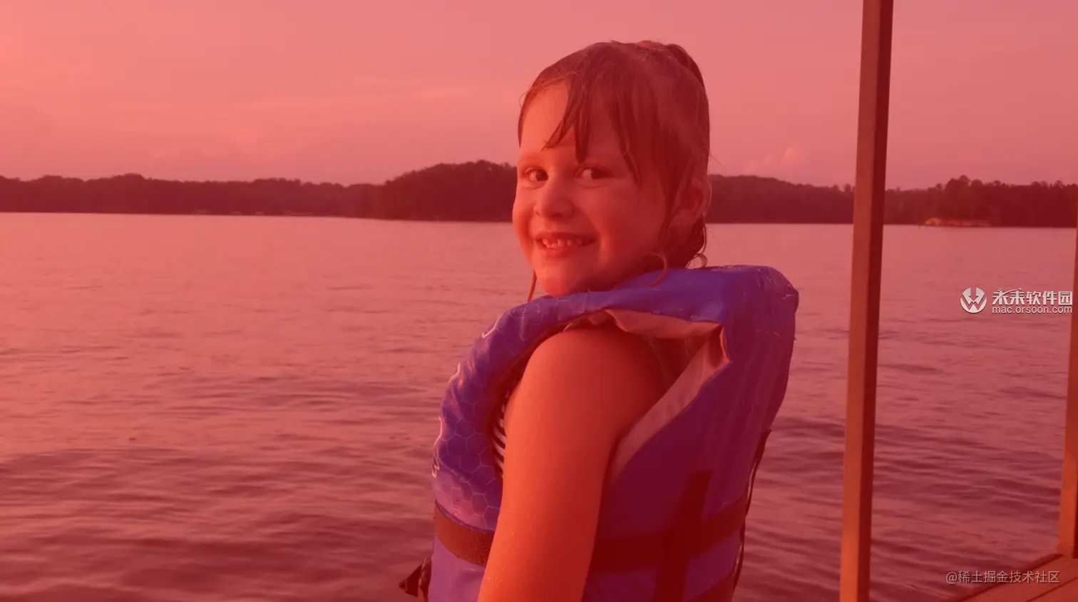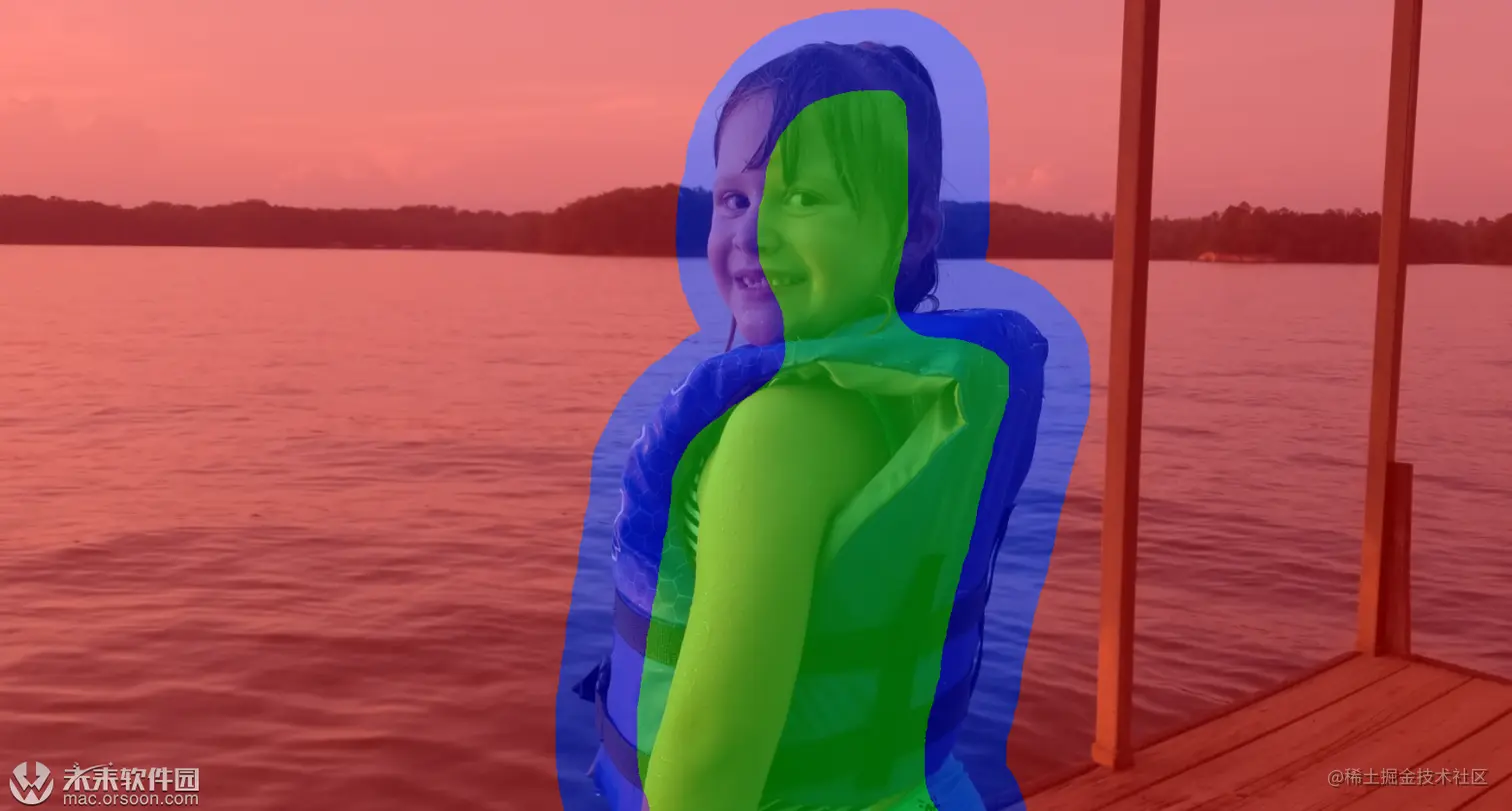 在此示例中,蓝色水和蓝色救生衣足够相似,以至于有助于标记她的救生衣的皮带,以遮盖救生衣和皮带之间的水。