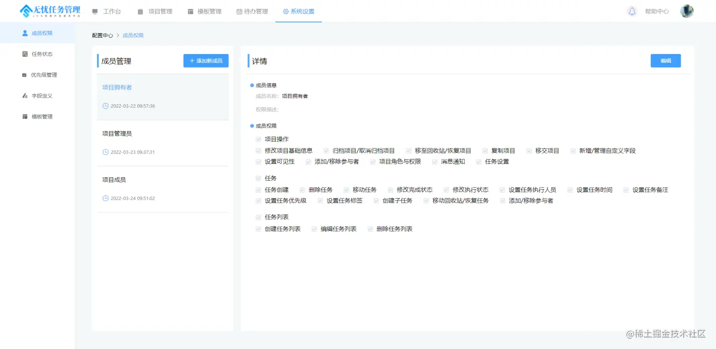 提供成员权限管理、状态配置、字段自定义、模板配置功能