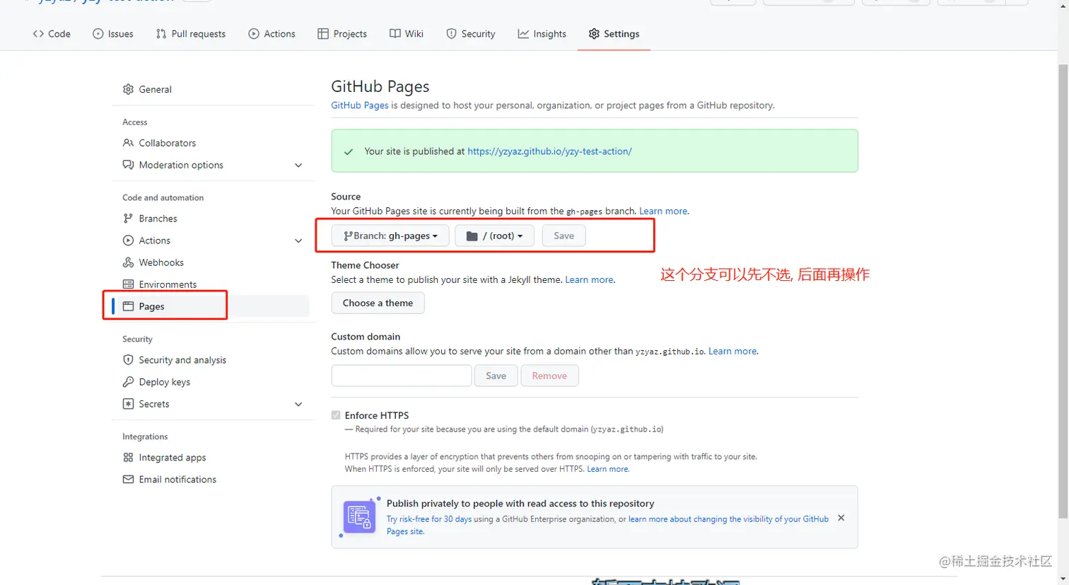 这里讲把他加上, actions配置中有个branch就是他会生成的分支, 这个分支即可部署到pages, 把这个分支写上即可, (写不上可以先推上去, 触发了actions成功后会有个gh-pages分支可选)