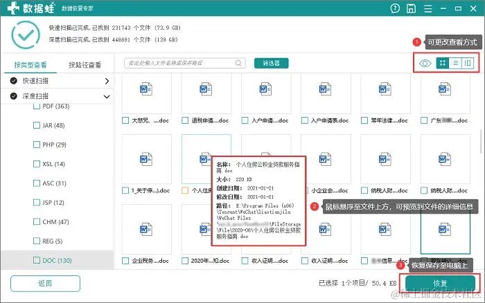 3)扫描完成后,在左侧的结果中找到自己要恢复的文件,图片类型的文件大部分可双击预览,也可以切换视图查看详细信息,确认选择后点击“恢复”!