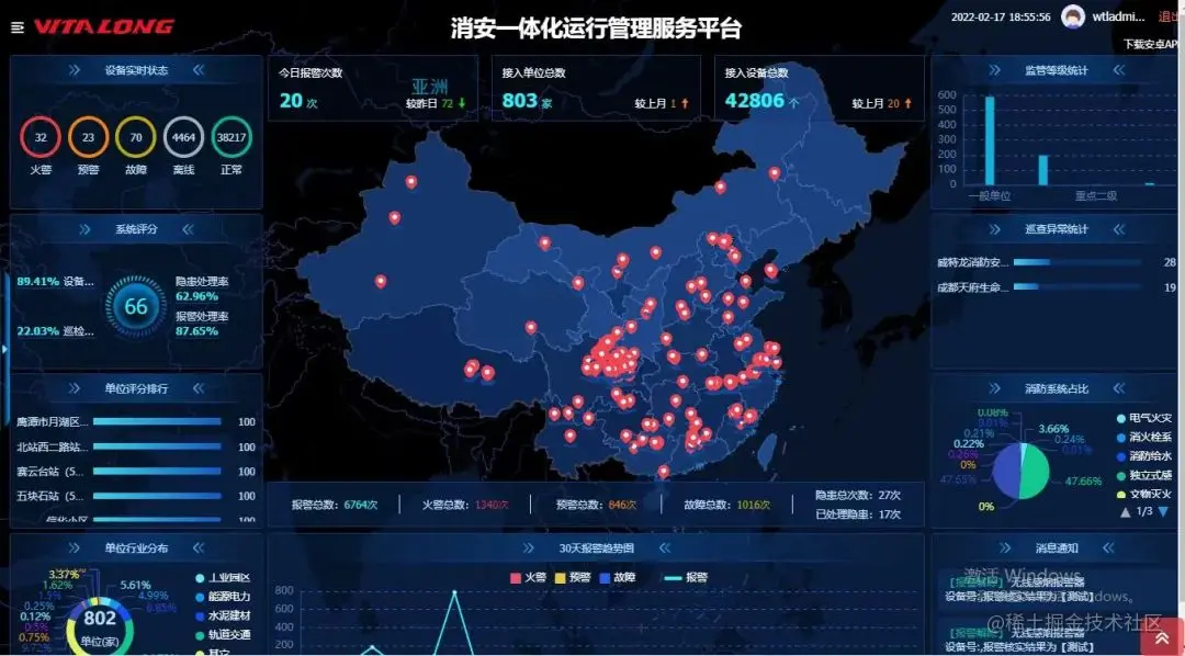该平台借助云计算、大数据、物联网技术,实现对城市消防自动报警系统、电气火灾监控系统、可燃气体监测报警设备、专业消防灭火设备、AI视频监控、环境监控系统、光纤传感器等多种数据的采集及应用分析。