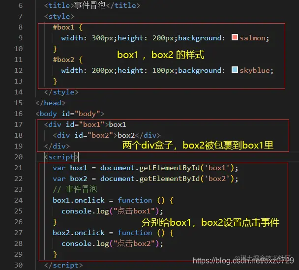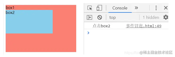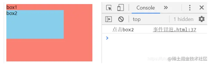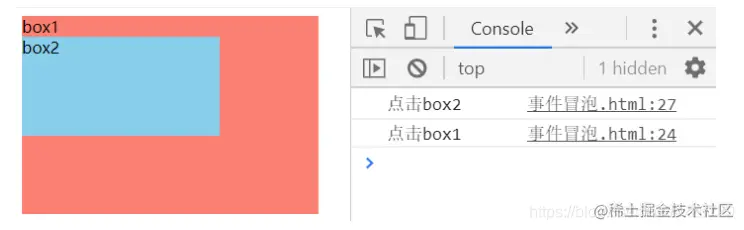 因为box2在box1里面,所以点击box2时,也同时点击了box1,这就是事件冒泡
