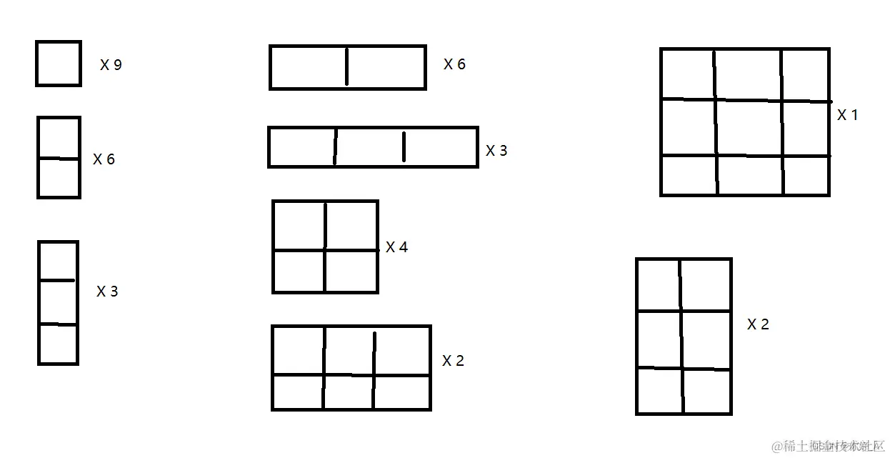 此时长是3,宽是3,那我们就可以枚举出下列样子的单元格: