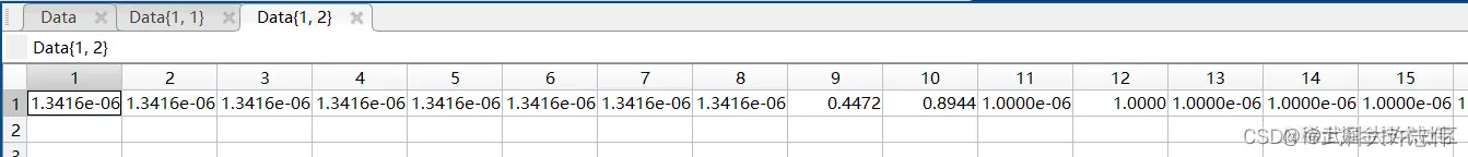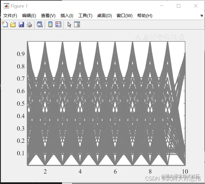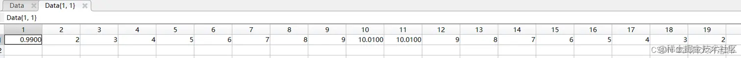 - 点开第一个单元格,可以看到数据的保存格式,表示平行坐标图的横轴,是从1-10然后从10-1的不断重复的序列,第二个单元格中存储的是对应的目标函数值