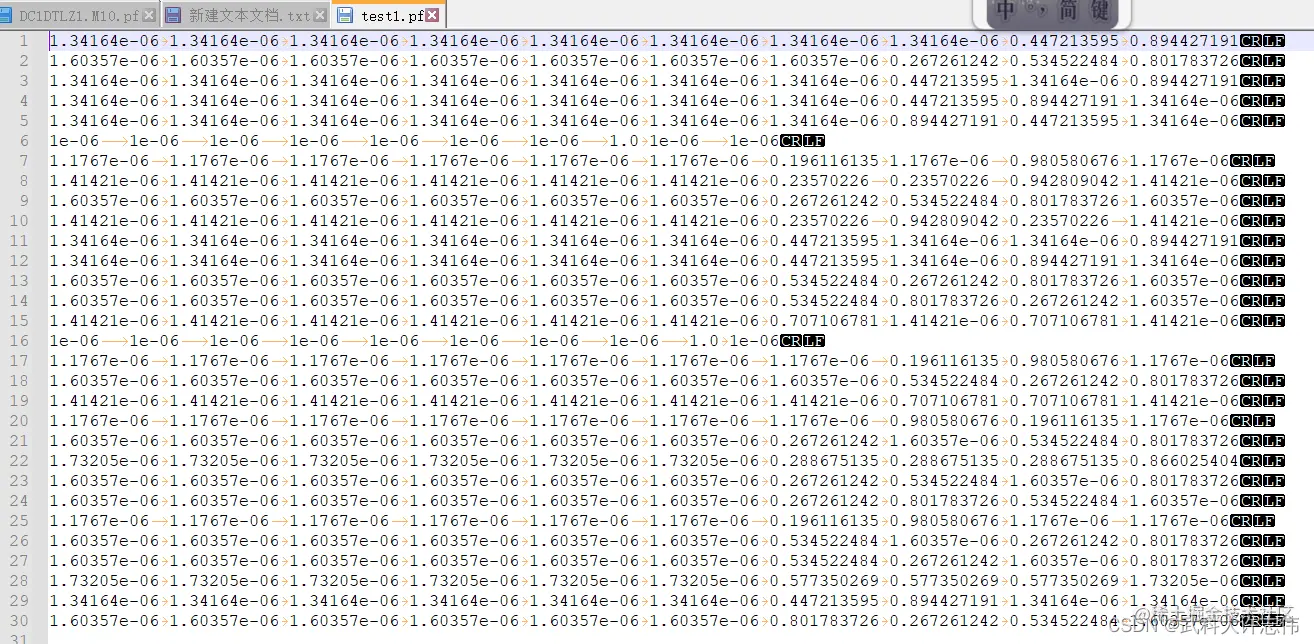 - 可以来看看最终结果,这里使用30行数据为例,test1.csv单数行被改到test1.pf的前15行,而转换顺序后的test1.csv的双数行被改到test1.pf的后15行。
