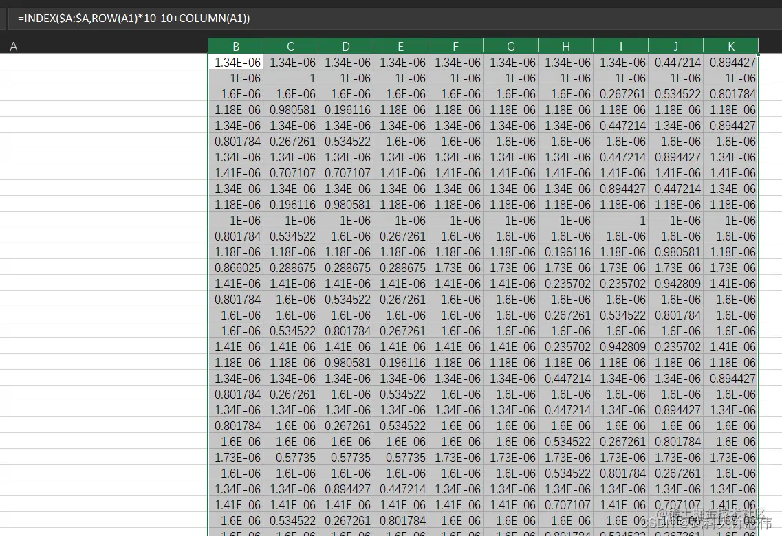 =INDEX($A:$A,ROW(A1)*10-10+COLUMN(A1))在单元格选中,然后向右拖10行,然后选中行,向下拉满 处理好后的数据如图所示: - 但是其双数行还是从10-1的目标索引进行排列,为了保持一致,其双数行需要变成从1-10的目标索引进行排列