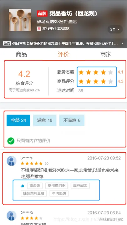 商家评论列表部分和商品评价部分设计思路相同,但是没有做成大的评论组件,在于DOM结构还是有区别的。