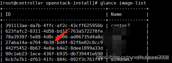3、进入控制节点后台,glance image-list 找到刚才创建出来的快照ID
