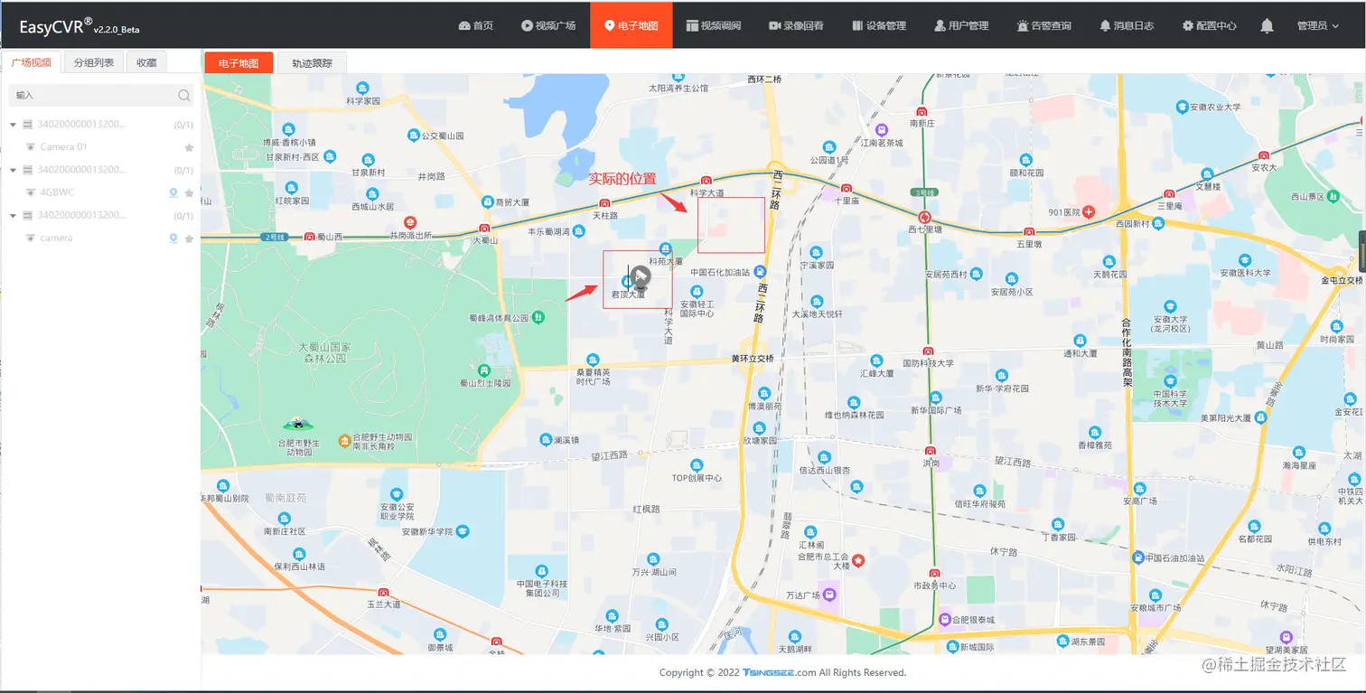在测试中,我们发现EasyCVR的电子地图显示的并不是当前实际设备的地理位置坐标,存在一定的偏差,如图: