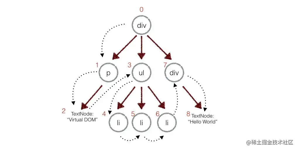 在实际的代码中,会对新旧两棵树进行一个深度优先的遍历,这样每个节点都会有一个唯一的标记: