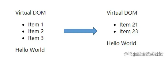 DOM改变了当前的状态不需要立即的去更新DOM而且更新的内容进行更新,对于没有改变的内容不做任何操作,通过前后两次差异进行比较 -