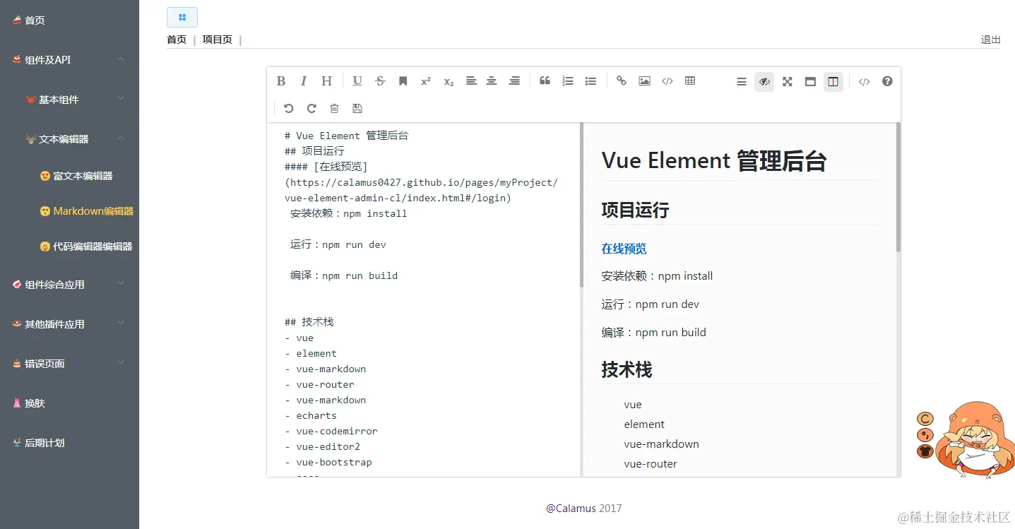 另外我的demo还用到了富文本编辑器vue-editor2,代码编辑器vue-codemirror,markdown编辑器vue-markdown,所以还需要别的安装依赖,有兴趣可以自己尝试